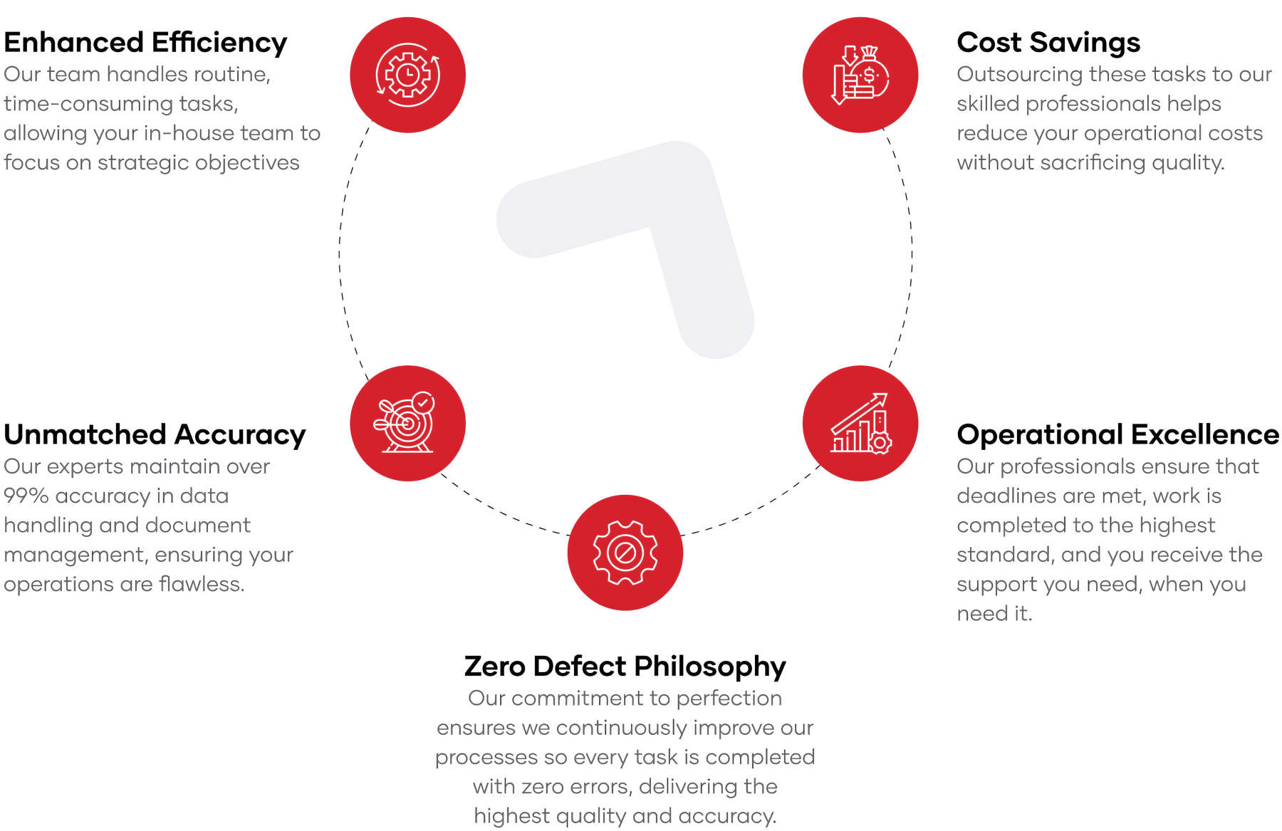 Our experts maintain over 99% accuracy in data handling and document management, ensuring your operations are flawless.